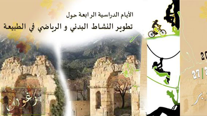 ينظم المرصد الوطني للرياضة بالشراكة مع المندوبية الجهوية لشؤون الشباب والرياضة بزغوان الأيام الدراسية الرابعة حول تطوير النشاط البدني والرياضي في الوسط الطبيعي وذلك بولاية زغوان أيام 25 و 26 و 27 اكتوبر 2019.