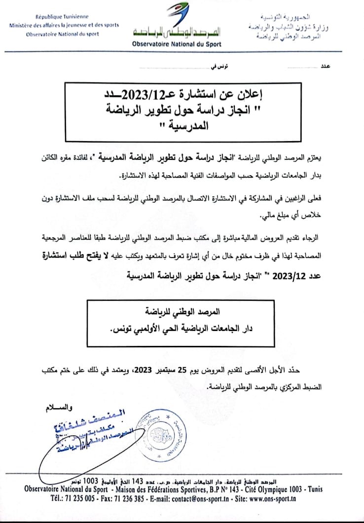 استشارة عدد 12/2023 لإنجاز دراسة حول تطوير الرياضة المدرسية
