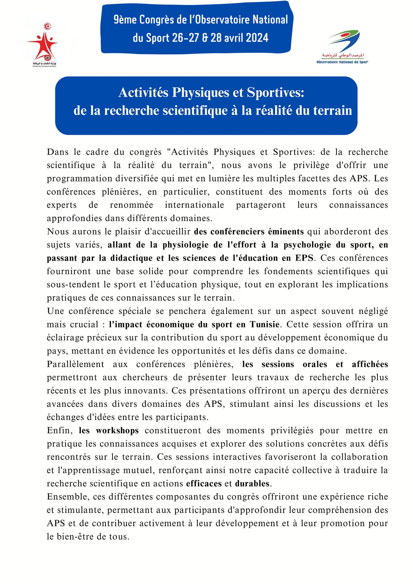L'Observatoire National du Sport est une institution publique dédiée à l'observation, l'analyse et le développement du domaine sportif, à travers l'élaboration de recherches et d'études, la collecte de statistiques, et l'organisation de formations et de rencontres scientifiques pour soutenir la prise de décision et promouvoir le sport.